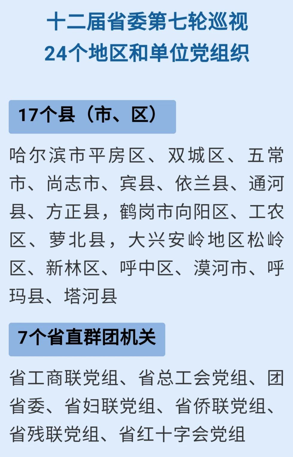 本轮巡视组建12个巡视组,巡视24个地区和单位党组织。